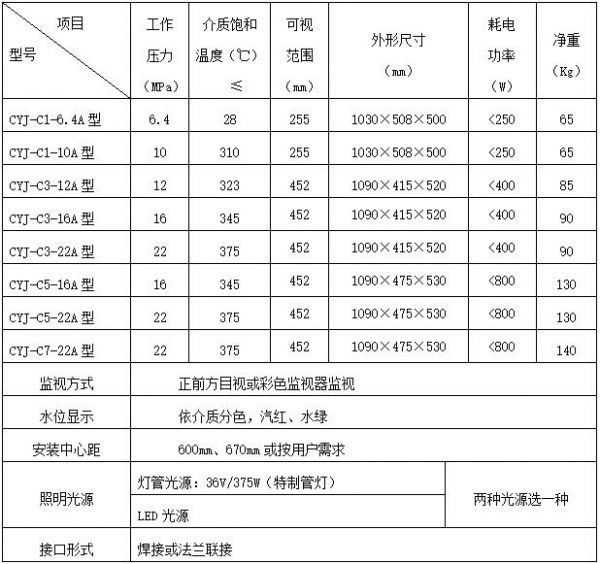 `CYJ型窗式高壓、超高壓彩色液位計(jì)是用于各發(fā)電廠(chǎng)、石油化工行業(yè)及各工礦企業(yè)的蒸汽鍋爐或其它壓力容器監(jiān)測(cè)水位的一次就地直讀儀表。它是在總結(jié)國(guó)內(nèi)外各種透射式雙色水位計(jì)優(yōu)點(diǎn)基礎(chǔ)上新研制的長(zhǎng)窗式高壓、超高壓雙色水位計(jì),用汽紅水綠顯示液位,無(wú)水全紅、滿(mǎn)水全綠。紅綠色界面即為實(shí)際水位。可在現(xiàn)場(chǎng)直接觀(guān)察也可以配我公司生產(chǎn)的彩色工業(yè)電視監(jiān)視系統(tǒng),在控制室內(nèi)的監(jiān)視器熒屏上遠(yuǎn)程監(jiān)測(cè)現(xiàn)場(chǎng)實(shí)際水位。它與其它雙色水位計(jì)相比較,具有如下幾種特點(diǎn):